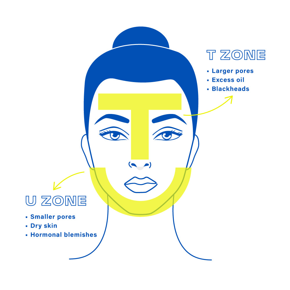 Your T Zone is your nose, forehead, and sometimes chin, depending on how oily you get. Your U Zone is your cheeks and jaw.