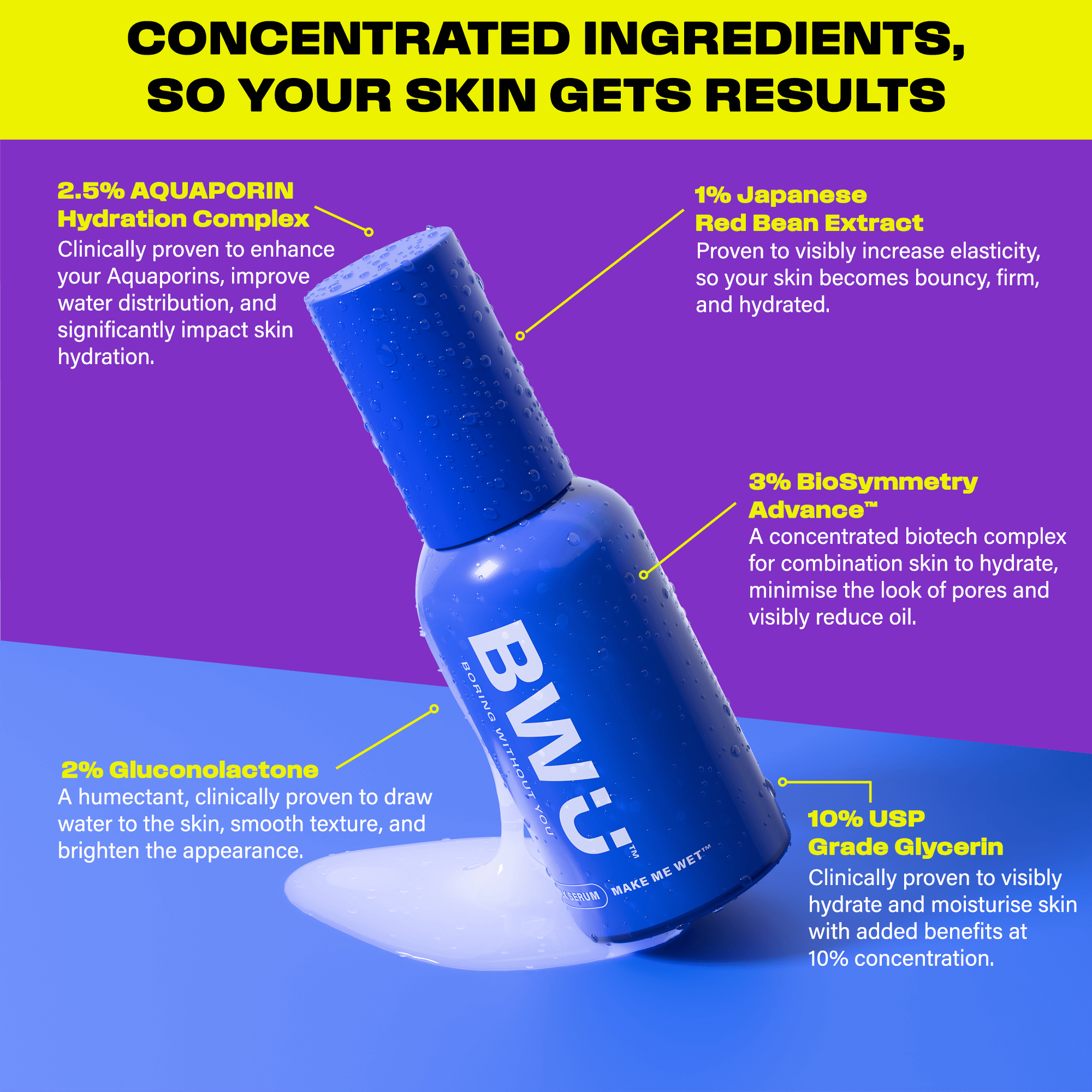 Make Me Wet™ is a highly hydrating daily-use serum with a multi-faceted formulation that ensures deep and long-lasting hydration. It has a thick texture with easy spread across the skin that makes your face feel smooth, plump, bright, and healthy.
