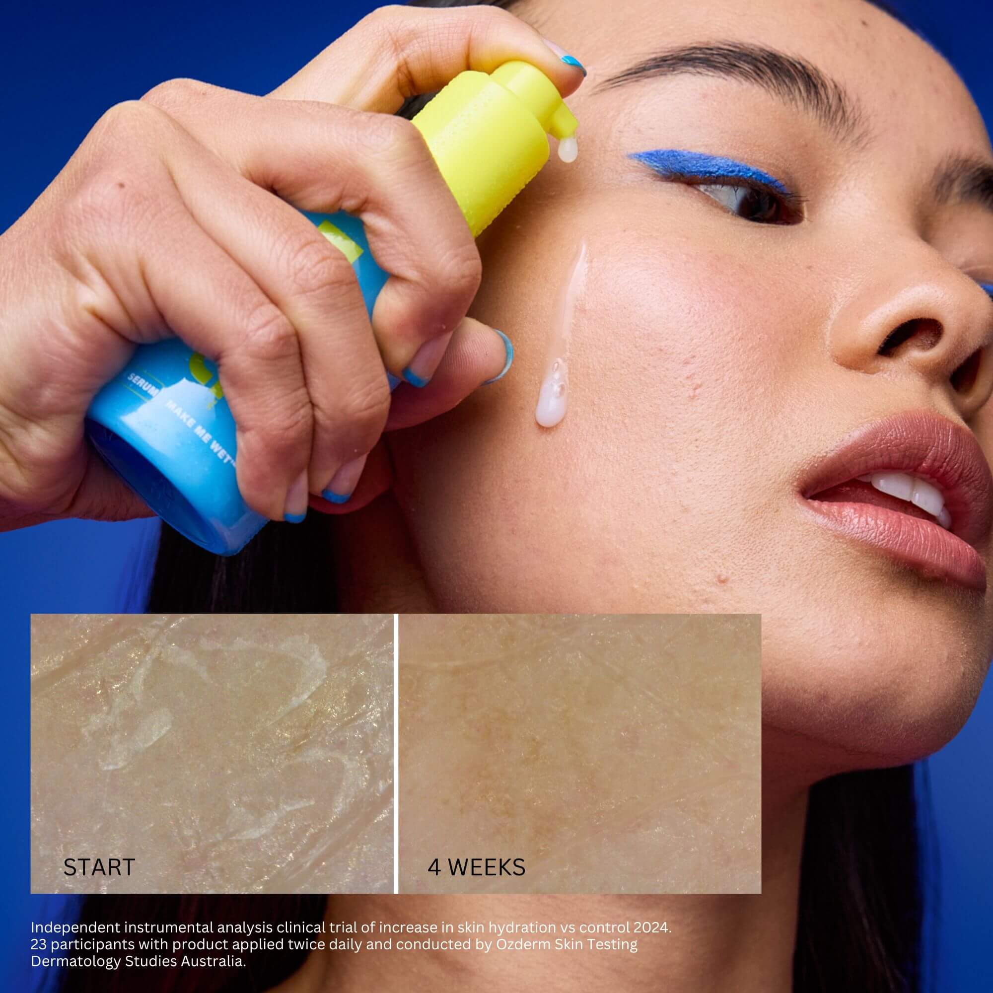 Independent instrumental analysis clinical trial measuring increase in skin hydration vs control 2024. 23 participantswith product applied twice daily over 4 weeks and conducted by Ozderm Skin Testing Dermatology Studies Australia.