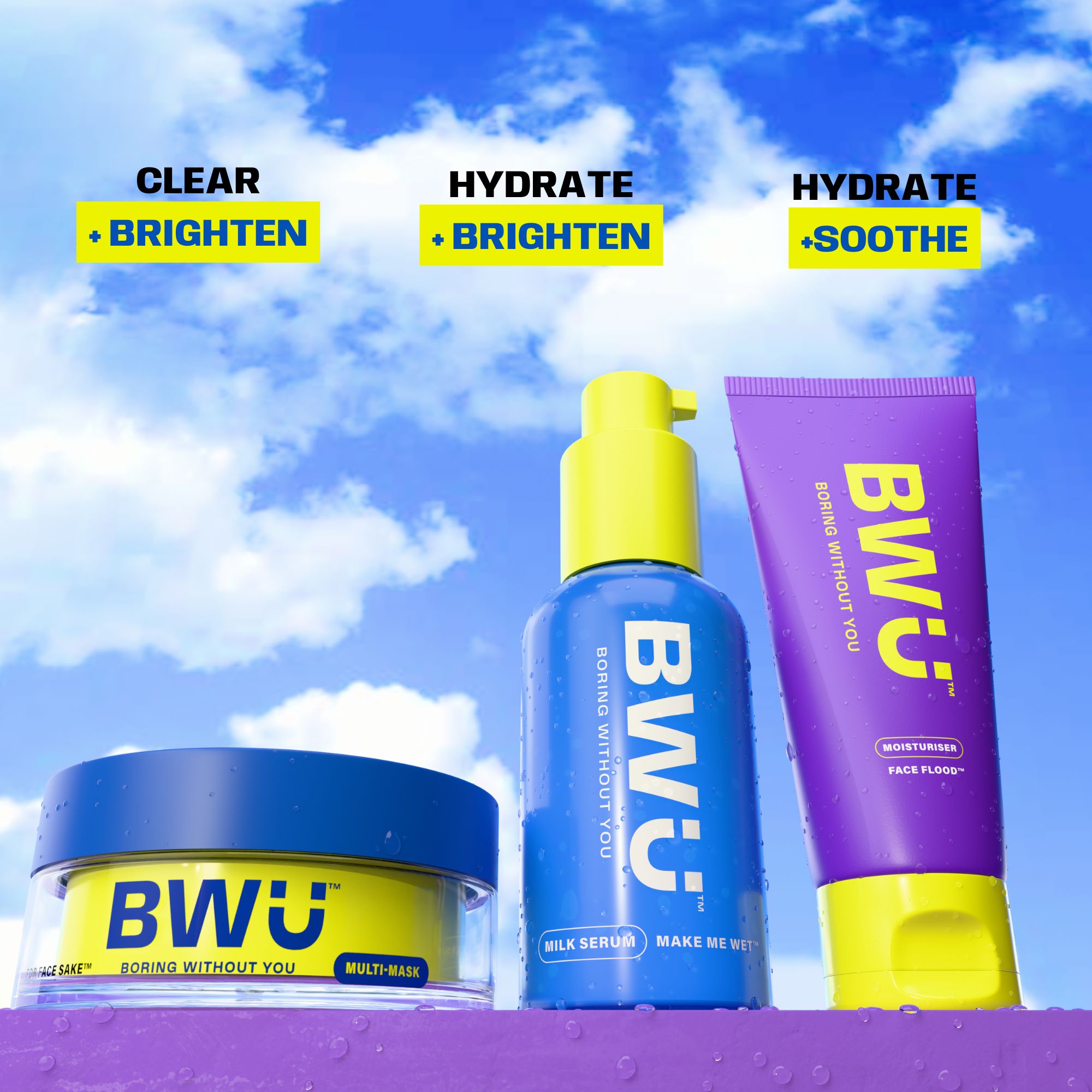 Cleanse your face and then use the For Face Sake™ Multi-mask. Wash it off and use the Make Me Wet™ AQUAPORIN Hydrating Milk Serum, followed by the Face Flood™ AQUAPORIN Hydrating Gel Moisturiser.